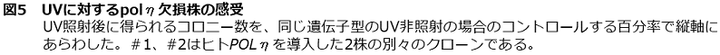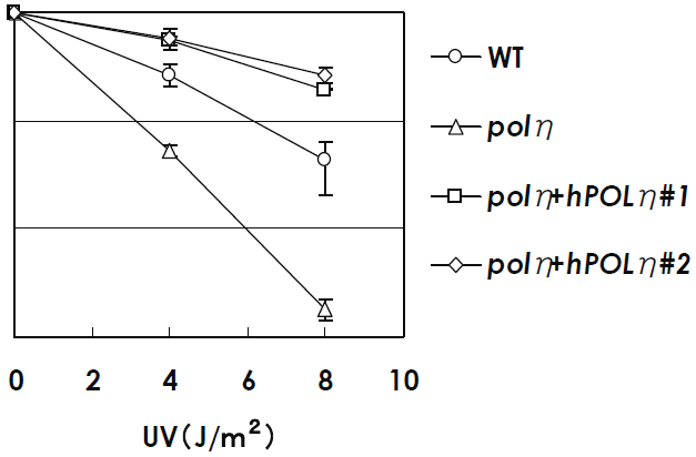 HRにおけるpolηの役割を調べるために、高等動物細胞の中で比較的効率よく遺伝子ターゲティングを行うことが出来るニワトリBリンパ細胞由来のDT40細胞株を用いて、polη欠損細胞株 (polη) の樹立を試みた10)。まず、ニワトリのPOLη cDNAを単離しアミノ酸配列を調べたところ、種を超えてよく保存されている五つの領域が、ニワトリにもあることが確認され、ヒトのその部分との相同性は約78%であった。全体として、ヒトpolηとの相同性は約78%だった。このニワトリPOLη cDNAの情報を元に、ニワトリpolηのノックアウト用コンストラクトを設計した。目的のPOLη遺伝子座への遺伝子ターゲッティングがおきているかどうかはサザンブロット解析により、また、遺伝子ターゲッティングの結果、確実にPOLηの転写が阻害されていることはRNAプロテクションアッセイによって確認した。3株のpolηが得られ、それらpolηの増殖速度は野生型 (wt) とほぼ同等であった。UVに対する感受性は、UV照射後のコロニー形成率を、UVを照射しない場合のコロニー形成率と比較することによって調べることが出来る。この方法を使ってpolηのUVに対する感受性を調べてみたところ、wtより明らかに感受性が高まり、UVに対する耐性が低下していた。また、polηにヒトPOLη遺伝子を導入し発現させることにより、polη欠損によるUVに対する耐性の低下を補うだけではなく、さらに耐性を上げることも出来た (図5)。これらのことにより、得られたpolηは、ヒトXP-V細胞と似た表現型を持つことが確認された。