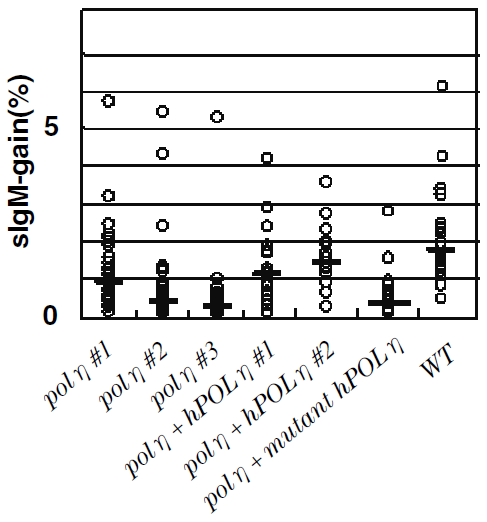 ある一定時間内に、抗体遺伝子可変領域の多様化にかかるHR (Ig gene conversion) がどれだけおきるかを測定する評価法を用いて、Ig gene conversionにおけるpolηの役割を検討した10)。我々がpolηを得るために用いたwtのDT40細胞株は、抗体遺伝子可変領域にグアニン (G) 一塩基分によるフレームシフトを起こしており、sIgMを産生することが出来ない12)。このフレームシフトを持つ領域が、Ig gene conversionによって置き換われば、sIgMを発現するようになる (図7)。よって一定期間の培養中に、sIgMを発現するようになった細胞を、イムノアッセイを利用してカウントすればIg gene conversionを起こす能力が評価できる13)。我々が単離した3株のpolηも上記のようなフレームシフトが保存されていることが確認できた。そこで、wtと3株のpolηについてそれぞれsIgMを発現していない細胞から30~40のサブクローンを得、それらを別々に3週間培養し、それぞれのサブクローンについてsIgMを発現している細胞がどれだけの割合で存在するかカウントした。その結果、polηについては、その割合がwtの1/2~1/6のレベルに減少することがわかった。また、polηにヒトPOLη遺伝子を導入し発現させることによって、割合をwtのレベルに近づけることが出来ることも確認できた (図8)。そこで、Ig gene conversionにpolηのポリメラーゼ活性が実際に必要かどうかを確認するため、2箇所の変異が入ったヒトPOLη遺伝子をpolηに導入し、活性を失ったpolηを発現させ、同様に試験をしてみた。その結果、polηに活性を失ったpolηを発現させても、sIgMポジティブな細胞の割合は低下したまま (図8) であり、Ig gene conversionにおいてpolηはDNA合成に直接関わっていると考えることが出来る。