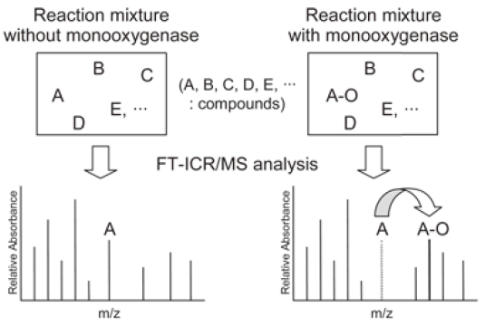 FT-ICR/MSを利用した酵素の基質探索法は、酵素を複雑な化合物混合溶液と反応させて反応液をFT-ICR/MSに直接導入し、一斉解析して基質となる化合物を探索するという非常にシンプルな方法である。図1にモノオキシゲナーゼをターゲットとした場合について示す。化合物混合溶液に対してモノオキシゲナーゼを含む反応液と含まない反応液を用意してFT-ICR/MS分析を行う。化合物Aが酸化されたとするとAのマスピークは酸素の質量数分だけシフトするので、酸化生成物を精密質量数に基づいて同定することができる。さらに、酸素同位体18O2存在下で反応を行うと、酸化生成物のマスピークは18Oと16Oの精密質量数差分だけシフトするため、これにより同定能を高めることができる。