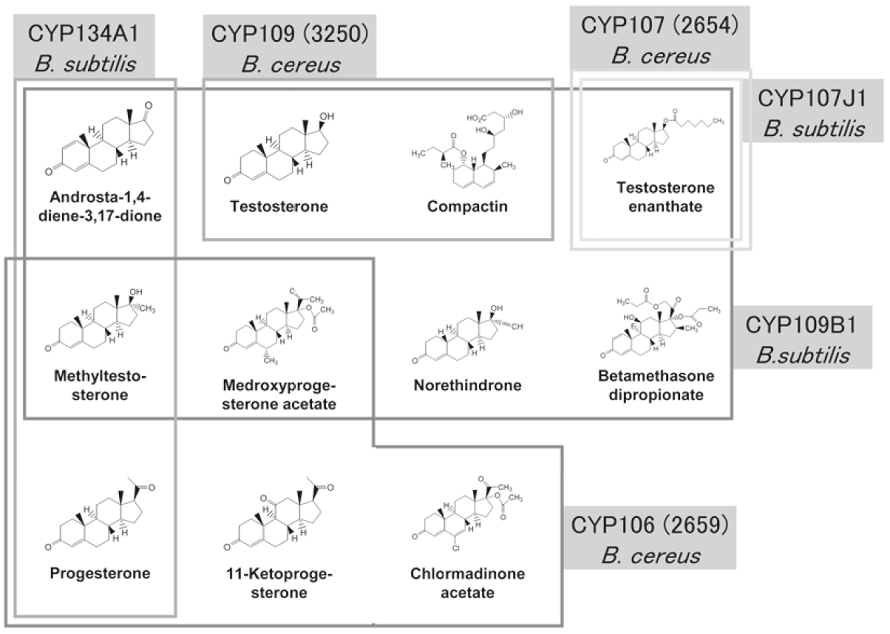 図4 FT-ICR/MSを利用した探索法により見出されたBacillus由来P450の基質
