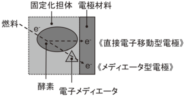 電極上へ酵素を安定かつ高密度に固定化する手法が永年研究されてきた。最近では、酵素の高密度固定化のために、カーボン微粒子などによる多孔質電極の有効性に注目が集まっている。電極の比表面積を増大させることによって単位電極面積当たりの酵素固定化量を増やし、燃料や酸素の反応面積を増やすことで電流密度を増大させることができる。
