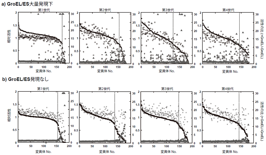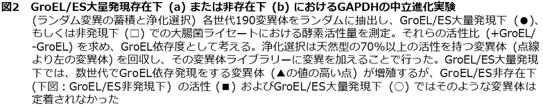 我々は、どの程度シャペロンが変異による安定性低下の影響を緩衝するかを観測するため、大腸菌GroEL/ESの大量発現下で、酵素の実験室内進化実験を行った。roEL/ESの発現をアラビノースプロモーターで制御し、酵素の発現をT7プロモーターで制御することで、GroEL/ESと酵素の共発現系を確立した。単純な実験のモデル図を図1に示す。まず、酵素の中立進化実験 (変異と浄化選択の繰り返し:平均1アミノ酸変異/遺伝子) を行い、どの程度GroEL/ESが不安定化する変異を緩衝できるのかを観察した。GAPDH (Glyceraldehyde dehydrogenase) における中立進化の結果を図2に示した。各世代190変異体をランダムに抽出し、GroEL/ES大量発現下 (●)、もしくは非発現下 (□) での大腸菌ライセートにおける酵素活性量を測定した。それらの活性の比 (▲:+GroEL/-GroEL) を求め、それをGroEL依存度の指標とした。浄化選択は、天然型の70%以上の活性を持つ変異体 (点線より左の変異体) を回収することにより行った。回収された変異体ライブラリーにさらに変異を加え、浄化選択を4世代ほど繰り返した。GroEL/ES大量発現下では、数世代でGroEL依存発現する変異体 (▲の値の高い点) が増殖した (図2上)。一方で、GroEL/ES非存在下ではそのような変異体は蓄積されなかった (図2下)。いくつかの変異体の可溶性発現をSDS-PAGEによって調べたところ、GroEL/ES非発現下における触媒活性の大きな減少は酵素の凝集化によるものであることが確認された (図3)。3、4世代目で得られた変異体のアミノ酸配列を解析すると、GroEL依存性となった変異体 (+GroEL/-GroEL>2は、GroEL非依存性の変異体と比較して、2倍以上 (3.5 vs1.6 アミノ酸変異/遺伝子) のアミノ酸変異が蓄積していることがわかった。さらに、GroEL非依存性の変異体ではほとんどの変異がタンパク質表面に分布していたにもかかわらず、GroEL依存性の変異体では、多くのアミノ酸変異はタンパク質のコアにも広く分布していた。計算機プログラム (FoldX) でそれらの変異による熱力学的安定性への影響 (ΔG) を解析すると GroEL 依存性変異体では遺伝子あたり3.5 kcal/mol安定性が低下していたのに対し、GroEL非依存性の変異体ではの進化では1 kcal/molほどしか低下していなかった。つまり、GroEL/ESは、タンパク質の安定性の低下を2.5 kcal/mol程度緩衝することで、タンパク質に蓄積する変異の数、種類に大きな影響を及ぼしたことが、我々の実験室内進化実験により示された。他の2つの異なる酵素、PTE (phosphotriesterase)、CAII (carbonic anhydorase) を用いて同様に中立進化実験を行ったところ、ほぼ同じ結果が得られた。これらのことから、GroEL/ESの大量発現は、アミノ酸変異による安定性の低下によって引き起こされる酵素の凝集による不活性化を防ぎ、進化の過程でより多くの変異の蓄積を可能とすることで、酵素の進化速度を促進していることが示された。