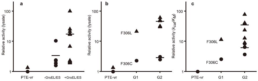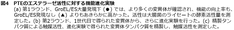 GroEL/ESは酵素の機能進化の側面においても、進化速度を促進する役割を果たすのであろうか。この疑問に対し、我々は、フォスフォトリエステラーゼ (paraoxon) であるPTEを、エステラーゼ (2-naphtylhexanoate) に進化させるモデル実験を、GroEL/ESの大量発現と非発現下の両条件下で行った。すると、GroEL/ES大量発現下では、機能が向上した変異体が非発現下と比較して2倍程度得られた。また、それらの触媒活性は10倍以上向上していることが確認された (図4)。得られた変異体の安定性を調べてみると、GroEL/ES大量発現下で得られた変異体の安定性は軒並み低下しており、GroEL/ES非存在下で変異体を発現させてみると、それらの変異体は凝集する傾向にあることがわかった。これらのことは、GroEL/ESが機能を向上させるが安定性を低下させるアミノ酸変異によるPTE変異体の凝集を防ぎ、機能向上を担保していることを示している。