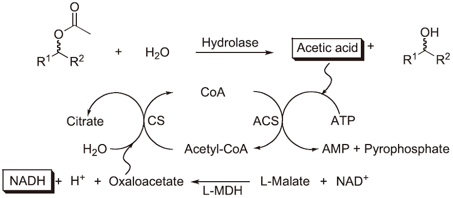 The most frequently used methods are based on photometric and fluorimetric assays performed in microtiter plate (MTP)-based formats in combination with high-throughput robot-assistance. They allow a rather accurate screening of several 10 000 variants within reasonable time and provide sufficient information about the enzymes investigated, i.e. activity by determining initial rates or endpoints and stereoselectivity by using both enantiomers of the compound of interest. For the determination of lipase/esterase activity and enantioselectivity, we developed an assay, in which acetates can be directly used as ‘true’ substrate. This method is based on a commercially available "acetic acid" test (R-Biopharm GmbH, Darmstadt, Germany), which couples the hydrolysis of acetates with an acetate-dependent enzymatic cascade leading to the stoechiometric formation of NADH39) (Scheme 1). If enantiomerically pure chiral (R)- and (S)-acetates are used in separate experiments but using the same enzyme variant, the method allows the determination of the (apparent) enantioselectivity. It was successfully used to identify an esterase variant with high enantioselectivity in the synthesis of 3-butyn-2-ol40). Several elegant screens were developed by Reymond and coworkers, which are based on the release of resorufin, coumarin or the formation of adrenochrome and avoid the often observed instability of the enzyme substrate41). Disadvantages are the need for synthesis of the specifically designed substrates and that only end-point measurements are possible rather than quantification of enzyme kinetics. A very simple and carefully optimized assay (Quick E) for hydrolases is based on the use of pH indicators and allows the rather accurate determination of enantioselectivity starting from the true substrate42,43).