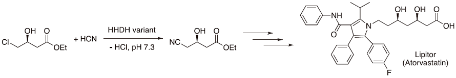 The catalytic function of a halohydrin dehalogenase (HHDH) from Agrobacterium radiobacter was improved by ProSAR-driven evolution to obtain ethyl (R)-4-cyano-3-hydroxybutyrate, which is also used in the synthesis of atorvastatin (Lipitor) (Scheme 2)36). The new enzyme had a 4000-fold volumetric productivity in the cyanation process compared to the wildtype.