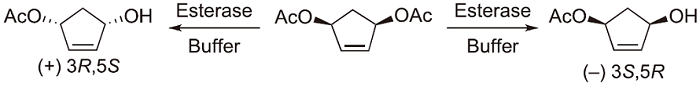 In addition to the example given in the introduction, we could show that the metagenome is a very rich source of novel biocatalysts even showing opposite enantioselectivity. For instance, we found 35 esterases / lipases originating from metagenome sources to be active and selective in the asymmetric hydrolysis of cis-3,5-diacetoxycyclopent-1-ene (Scheme 3)53). Subsequent analytical and laboratory scale biocatalysis reactions identified three enzymes showing excellent (-)-preference and one esterase with excellent (+)-selectivity. In another project, we were able to identify several hydrolases from the metagenome to be useful in the kinetic resolution of esters of tertiary alcohols54).