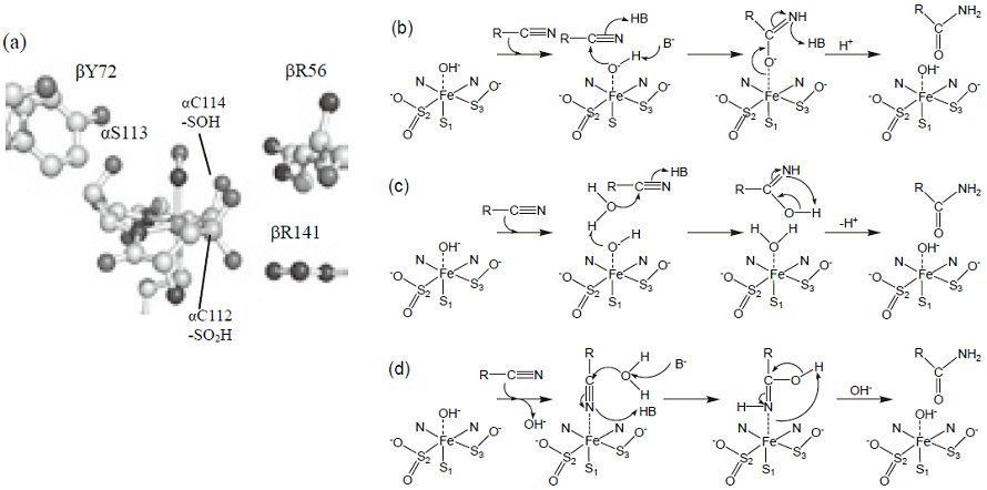 1997年に鉄型NHaseの結晶構造が明らかにされ7)、本酵素はαとβサブユニットのヘテロダイマーが2組会合したヘテロテトラマー構造をとること、金属イオンは両サブユニットの境界面に位置し、αサブユニット上の金属結合モチーフCys1-Xxx-Leu-Cys2-Ser-Cys3に結合していること、配位子はSerとCys3の主鎖アミド窒素、3個のCysのイオウ原子と溶媒の水分子であり、歪んだ6配位構造をとることなどが明らかになった。更に、1998年に筆者を含むグループにより同じ鉄型酵素の高分解能結晶構造が決定され8)、Cys2とCys3がシステインスルフィン酸 (Cys-SO2H) とシステインスルフェン酸 (Cys-SOH) に翻訳後修飾を受けていることが明らかになった (図1(a))。主鎖アミド窒素が金属に直接配位した酵素はNHaseが2例目であり、酸化修飾を受けたシステインを配位子とする酵素はNHaseが始めての報告例である。その後、伏信、若木らのグループによってコバルト型NHaseの結晶構造が決定され9)、更に、一次構造上高い相同性をもつチオシアネート加水分解酵素の結晶構造が筆者らによって明らかにされ10)、鉄型に見られる特異な金属反応中心の構造は、システイン酸化修飾も含めてNHaseと類縁酵素に完全に保存されていることが明らかになった。嫌気的に再構成させた未修飾の鉄型NHaseは触媒活性を示さないが、大気中に放置することで酸化修飾を受け、活性を発現した11)。すなわち、システイン酸化修飾は酵素活性に不可欠であることが判った。