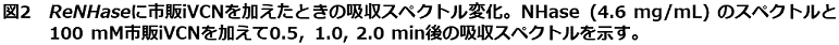 市販iVCNをReNHaseに添加すると、非ヘム鉄センターに特徴的な680 nmの吸収スペクトルが820 nm付近にシフトし、数分後に回復した (図2)。この結果は市販iVCNまたは試薬に含まれる不純物が非常にゆっくりと反応する可能性を示している。詳細な解析の結果、市販試薬に混入しているイソブチロイソニトリル (CH3CH(CH3)CH2NC; iBuNC) が遅い反応をする正体であることが判った。iBuNCの反応生成物を質量分析法によって解析したところ、イソブチルアミン (CH3CH(CH3)CH2NH2; iBuNH2) であった。同様な反応は他のイソニトリルでも観測され、ReNHaseはイソニトリルをアミンに加水分解する新規な酵素活性をもつことが判った15)。イソニトリルは極めて高い競争阻害活性を示すことから、ニトリルと同様の触媒反応過程を経る可能性が高い。そこで、イソニトリルを基質としてReNHaseの時間分割構造解析を行うことを考えた。iBuNCは化学的に不安定なため、以降の反応はtert-ブチルイソニトリル (tBuNC) を用いることにした。イソニトリル炭素由来の生産物をATR-FTIRで分析したところ、一酸化炭素 (CO) であることが判った。すなわち、ReNHaseは②式に示す新規反応を触媒する。