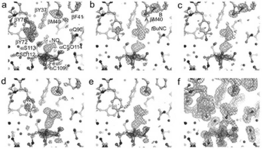 基質を添加する前の構造は既に決定されているニトロシル型酵素の結晶構造と極めて良く似ていた (図3(a))。tBuNCを加えた結晶では、tBuNC分子の電子密度が基質ポケット内に明瞭に確認され、–NC基はFe3+に対して逆側に配置していた (図3(b))。疎水性の高い基質ポケットにtBuNCの3級ブチル基が入り、かつ、反応中心のFe3+にはNOが配位しているため、-NC基が空間的に余裕のある位置で安定化したと考えられる。