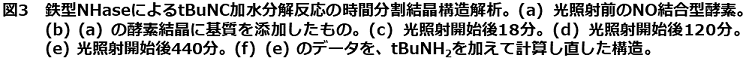 キネティクス測定から、tBuNC加水分解反応のKmはニトリル水和反応と同程度であるが、kcatは1.8×105倍小さい値であった。以上より、tBuNCは時間分割構造解析に適した基質であると期待された6,15)。