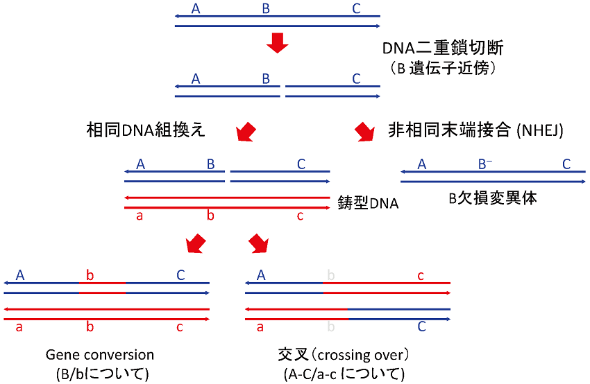 回復したDNA配列をもつ単鎖DNA部分が鋳型から離れて、切断の相手端にできた単鎖DNA部分の相補配列とアニールすると切断の両側の連続性を回復する (図3;左側第5段階)。残った単鎖ギャップが第2の修復DNA合成で埋められるとDNA二重鎖切断修復が完了する (図3;左側第6段階)。鋳型DNAをコピーした部分が対立遺伝子bなのでA-TまたはG-Cではない不整対 (mismatch) が残るが、それが対立遺伝子bの配列に従って修復される (図3;左側第7段階) と鋳型DNAの遺伝情報が組み込まれた組換え体 (A-b-C) として識別される。このように一対の親DNA (A-B-C : a-b-c) の一方だけが相手の遺伝情報で置き換えられる組換え (A-b-C : a-b-c) をgene conversion*2という (図1)。一対の親DNAの間でDNA部分を交換する (A-C : a-c →A-c: a-C) 交叉 (crossing over; 図1) は、ホリデー中間体を経て行われる (図3;右側段階5から7)4,5)。