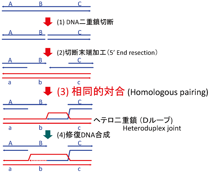 その仕組みを遺伝子A-B-Cを載せたDNAの遺伝子B近傍に起きた二重鎖切断の修復を例に説明したい。先ず、二重鎖切断末端で5’端から一方のDNA鎖が削り込まれて3’突出の単鎖DNA領域ができる (図2;第2段階)。その単鎖DNAに相同DNA対合蛋白質が働き、鋳型となる二重鎖DNA (組換えが観察できるようにA-B-Cの対立遺伝子*1 a-b-cを載せているとする) の中の相補配列を探し出し、その単鎖DNAを割り込ませ、A-TまたはG-Cの塩基対合によりヘテロ二重鎖を作る (図2;第3段階)。この反応を特に相同 (DNA) 対合という2,3)。割り込んだ単鎖DNAの3’端がプライマーとして始まる修復DNA合成で鋳型DNAの遺伝子bを含む塩基配列をコピーして切断で失われたDNA配列を回復する (図2; 第4段階)。
