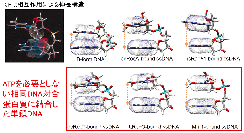先に述べた相同対合反応の中間体として共通に誘導される特殊なDNAの立体構造とは、各ヌクレオチドのDNAを特徴づけるリボース環2’位のメチレン基と、その次位の塩基の間で起きるCH-π相互作用によって塩基間が引き延ばされ塩基間スタッキングがない構造のことである。そのため二重鎖DNAであっても塩基の自由回転で相手の単鎖DNAとの相補配列を探しだせる18)。この伸長構造は、NMR技法で解かれた (図5)12,19)。CH-π相互作用によって安定化される伸長構造が相同対合の中間体ということは、2’OHの存在でこの構造をとれないRNAは、大容量のゲノム情報保持に必要な二重鎖構造をとると相同組換えができないことを意味する。事実、RNAゲノムをもつウイルスでは相同組換えは、突然変異や非相同組換えに比べても稀な現象であり、鋳型スイッチ (template switch) とよばれる単鎖DNA同士のアニーリングを基礎にした反応でしか起きない。突然変異や非相同組換えに比べはるかに高頻度で、普遍的に相同対合を基に相同組換えを行うDNAゲノムとは対照的である。ダーウインの進化論以来、伝統的に突然変異が新規遺伝子創出の原動力とみなされている。しかしながら、変異率はRNAの方がDNAよりもはるかに高いにもかかわらず、ゲノム情報の複雑さでは、RNAゲノムはDNAゲノムの足元にも及ばない。さらに、ミトコンドリアゲノムは核ゲノムより10倍も高い率で突然変異を起こす一方で、ヒトと酵母のミトコンドリアにコードされた蛋白質を比較すると、まるで進化していないことが分かる。ミトコンドリアゲノムは二重鎖DNAであるが、厳密な母系遺伝やホモプラスミー*3により相同組換えが起きても痕跡が残らない。これらの例は、突然変異というよりも,むしろ相同組換えの方が新規の遺伝子創出の強力な手段であることの反映ともみなせる20)。