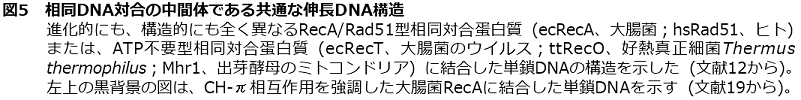 ATP存在下で大腸菌のRecA蛋白質が単鎖DNAに働いて相補配列をもつ二重鎖DNAと相同対合させることが発見されて2,3) から相同組換えの分子レベルでの理解が急速に進んだ。RecAと構造と機能がよく似たATPを補助因子として相同対合とDNA鎖交換反応を行う蛋白質が、真正細菌 (RecA)、古細菌 (RadA)6)、真核生物 (Rad51, Dmc1)7,8) から次々に見つかった。相同対合自身にはATP分解は不要だが、DNA鎖交換反応はATP分解に依存するヘテロ二重鎖伸長として見つかった。