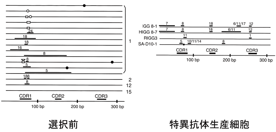 相同組換えによる新機能をもつ蛋白質創出への第一歩がADLib法の発明である。相同組換え率は、高い減数分裂期酵母細胞でも10-2レベル以下であり、高等動物細胞の相同組換えはそれよりはるかに低い。酵母の相同組換え開始制御の仕組みについての研究から、組換え開始に先立って、二重鎖切断が起きるDNA部位でヒストンのアセチル化が亢進して染色体が再編成されることが分った22)。瀬尾と太田らは、奇想天外な発展として、ニワトリのB細胞由来株化細胞をヒストン脱アセチル化酵素阻害剤で処理してみた。驚いたことに、核細胞当たり、ほぼ100%という超高頻度で免疫抗体遺伝子可変領域の相同組換えを誘導できた。さらに、抗原を結合させた磁気ビーズによって、その抗原に特異的に結合する抗体を生産する細胞を、組換え誘導処理細胞群の中から釣り上げ、1週間程度でクローン化とその抗体の多量生産ができた (ADLib法: http://www.jst.go.jp/pr/announce/20050530/index.html)23,24)。動物体を使わないこの手法は自己抗原など異物と認識されにくい困難抗原の抗体を取得する実績も挙げている。トリは、ヒトと異なり可変領域のカセットが軽鎖、重鎖それぞれに一つしかなく、代わりに可変領域に似た塩基配列を数十も含むクラスターがありそれを鋳型とするgene conversion型相同組換えによって多様な抗原特異性を獲得するといわれていた。ところが、実際に相同組換えの誘導で新規の特異性をもつ抗体を作らせたのは、これが初めてである。ヒストン脱アセチル化酵素阻害剤処理では相同組換えと共に、突然変異も同程度に誘導されるが、特異抗体を生産する細胞の可変領域はほぼ全て相同組換えでできており、突然変異の寄与はほとんどなかった (図6)23)。この相同組換えは、ヘテロ二重鎖に10%程度の不整対を含む必要があり、RecA/Rad51型蛋白質による不整対排除機能は抑制されていると考えられる。ADLib法の原理は抗体を超えて広く新規蛋白質創出に応用できるであろう。