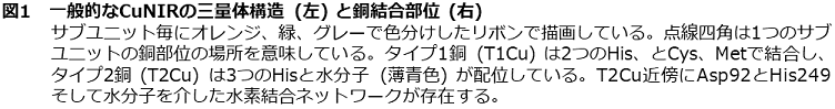 これまでに結晶構造が報告されている6 種類の CuNIR9-14) は、Hyphomicrobium種の六量体CuNIR13) を除くすべて、2種類の銅イオン (タイプ1銅とタイプ2銅) を1個ずつ結合したサブユニット3つからなる三量体構造 (分子量11 万で銅を合計6個含む) をとっている (図1)。分子量約3.7万のサブユニット単体は、約8本のβ鎖の束からなるβ-バレル構造 (キュプレドキシン-ホールドともいう) を2つ持った構造をしている。また、銅部位においてはいずれも歪んだ四面体四配位のタイプ1銅とタイプ2銅が、-ヒスチジン残基 (His129) -システイン残基 (Cys130) -のアミノ酸残基によって架橋され、約12.5Å離れて位置している。さらに、タイプ2銅の周りには[タイプ2銅配位水分子-アスパラギン酸残基 (Asp92) -水分子-ヒスチジン残基 (His249) ]の水素結合ネットワークがあり、基質 (NO2-) へのプロトン供給を担っている。本酵素はまず、タイプ1銅部位で電子供与 (伝達) 蛋白質から電子を受け取り、His-Cys架橋構造を経由した蛋白質内電子移動によりタイプ2銅に電子を送る。次に還元されたタイプ2銅部位でNO2-がNOに還元されて触媒反応が進行する。