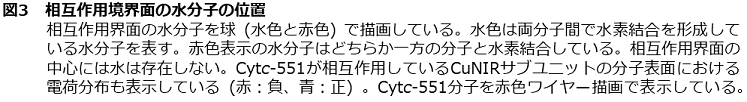 これまで単独の構造解析からCytc-551のヘム近傍表面とCuNIRのタイプ1銅近傍表面には小さな疎水性領域 (パッチ) があり水分子がまばらに点在することがわかっていたが、興味深いことに、それらの水分子は複合体を形成することで相互作用境界面の中心 (コア) から排除されていた (図3)。これは、お互いの相互作用部位に疎水的アミノ酸残基を多くすることでその部位表面での水分子の数を減らし、分子間相互作用時の水分子排除に係るエネルギーロスを最小限にしながらお互いの酸化還元中心を最も接近させるといった、生物が進化の歴史を経て獲得した分子間電子伝達反応機構における分子戦略なのかもしれない。