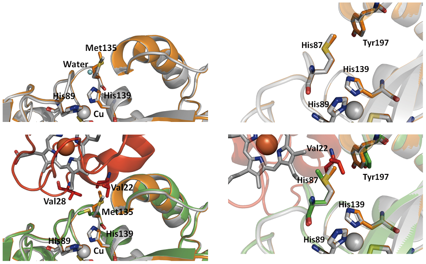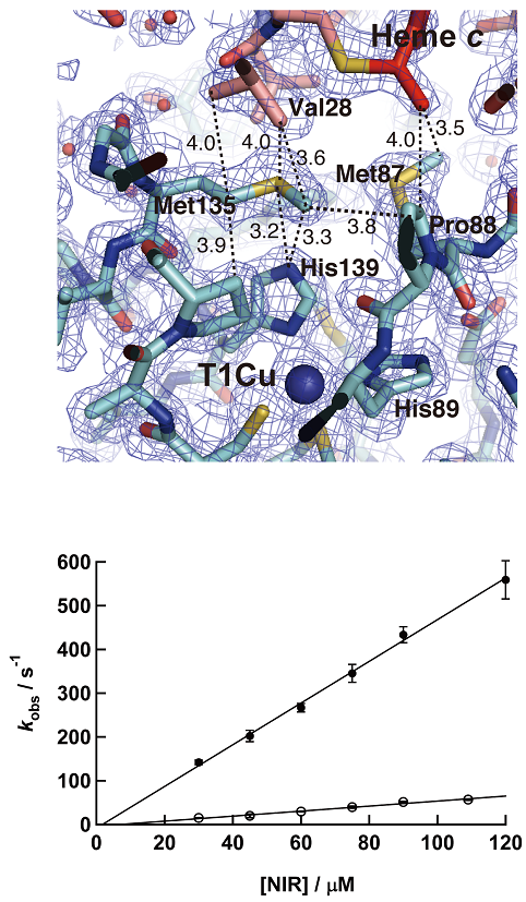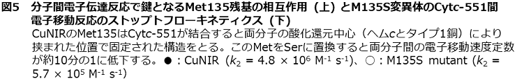 今回決定した複合体結晶構造では1対1で両分子が相互作用していた。すなわち、CuNIRはホモ三量体構造なので、残りの2つのサブユニットはフリーのままである。そこで、Cytc-551が結合していないサブユニットと結合したサブユニット構造を比較したところ、興味深い構造変化を確認することができた。両サブユニットの立体構造の重ね合わせ図からも明らかなように、Met87、Met135、Tyr197の側鎖構造に比較的大きな変化が見られた (図4)。特にMet135の側鎖構造は複合体形成時には、Cytc-551からのVal残基の接近によりタイプ1銅配位子の1つであるHis139の上部に覆いかぶさるような構造をとるが、結合していないサブユニットでは溶媒領域方向へ向いていた。その結果、Cytc-551が結合していないサブユニットでは、His139の上部には水分子が1つ水素結合距離内 (2.8Å) に存在している。すなわち、Cytc-551が結合するか否かで、タイプ1銅配位子のHis139周りの環境が変化していることになる。このHis139残基はタイプ1銅を含有する蛋白質特有の "溶媒露出His配位子" と呼ばれる残基で、その残基周辺の環境変化がドラスティックにタイプ1銅の酸化還元電位に影響を及ぼすことが知られている21)。すなわち、今回得られた複合体構造は、Cytc-551が相互作用することによりタイプ1銅配位His残基の環境が変化し、スムーズな分子間電子伝達が起こるようにタイプ1銅の酸化還元電位を調節していることを強く示唆させるものだった。そして、その役割を担う残基の1つがMet135残基である。その証拠の1つにMet135をSerに変異させるとCytc-551からCuNIRへの電子移動速度定数が約10分の1に低下する (図5)。これまで数多くCuNIRの変異体解析実験が報告されているが、このMet135残基を変異させた実験は本研究が初めてであり、これまで完全に見落とされていた重要な残基の1つを同定出来たことになる。今後、Met135Ser変異体とCytc-551の複合体やさらなる相互作用に関わる様々な残基の変異体を構築しその複合体結晶構造解析を行うことにより、より詳細な反応メカニズムの構造的基盤が構築されるであろう。