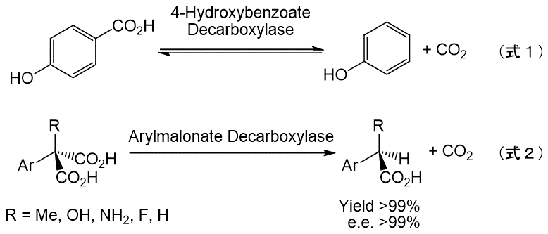 脱炭酸酵素は、カルボン酸から二酸化炭素を脱離する反応を触媒し、[EC 4. 1. 1. -]に分類される。脱炭酸酵素の中には逆反応であるカルボキシル化を触媒するものも存在し、様々な芳香族ヒドロキシカルボン酸の合成に適用されている1) (図1–式1)。一方、正反応である脱炭酸は、物質生産に利用されることはあまりなかった。本稿で取り上げる脱炭酸酵素は我々が独自に見出し、補酵素なしで直接マロン酸の脱炭酸を行うユニークな酵素である2)。本酵素は、非天然型基質であるアリールマロン酸に作用し、光学的に純粋なアリール酢酸誘導体へと変換する活性を持つため、物質生産の観点からも有用性が高い (図1-式2)。著者らは、本酵素を自然界から見いだし、その酵素学的諸性質や反応メカニズムを明らかにした。更に、配列や構造情報に基づいて最小限の変異を導入することで、本来酵素が持っていない様々な機能を付与することに成功した。また最近、X線結晶構造解析にも成功し、その興味深い反応メカニズムの全体像が見えて来たので紹介したい。