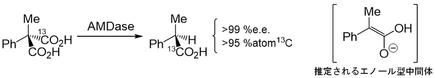 全国各地の土壌から、フェニルマロン酸を単一炭素源として集積培養を行い、アリールマロン酸に対する脱炭酸酵素活性を持つ細菌Alcaligenes bronchisepticusを分離した3)。培養条件の最適化を行ったところ、本酵素はフェニルマロン酸によってのみ誘導された。本酵素を各種クロマトグラフィーにより均一に精製したところ、分子量24 kDa (SDS-PAGE) のモノマー酵素であった。活性の発現には既知の脱炭酸酵素に必要な補酵素を要求しない、全く新しいタイプの酵素であった4)。基質特異性を調べたところ、アリール基が直接結合したマロン酸には作用するが、アルキルマロン酸には活性を示さなかった。また、二置換マロン酸にも作用して、高い光学純度のアリール酢酸誘導体を与えた。また、二置換より一置換のアリールマロン酸の方が高い反応性を示したことから、アリールマロン酸脱炭酸酵素 (以下AMDase) と命名した。現在では、[EC 4. 1. 1. 76]に分類されている。また、この株以外からも性質の異なるAMDaseの取得に成功5,6)しており、ライブラリーを構築している。