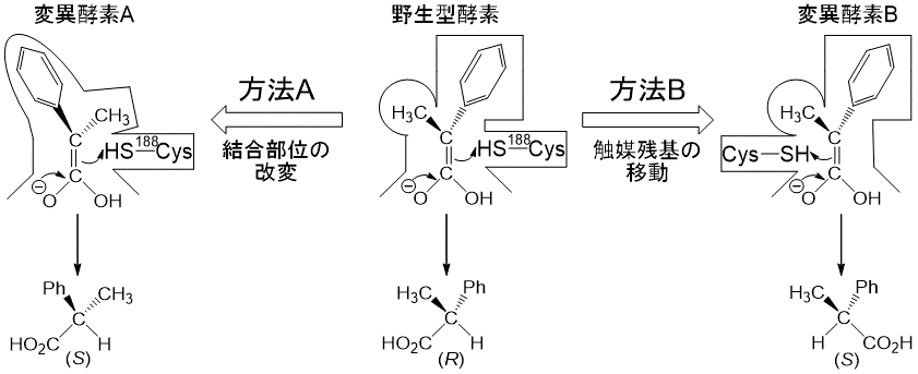 酵素の立体選択性を逆転することは、酵素の機能改変の中で最も困難な課題のひとつである。AMDaseの立体選択性を逆転する場合、2つの方法が考えられる。1つ目は、基質のフェニル基とメチル基が入る結合部位に変異を導入し、ポケットへの入り方を反転することである (図5-方法A)。しかし、この方法ではポケットの大規模な改変が必要であり難易度は非常に高い。2つ目は、プロトン供与を行うシステインの位置をエノール中間体の逆側に移動することである (図5-方法B)。この場合、188番目のシステインをプロトン供与能の低いものに置換し、反対側にシステインを導入するだけで比較的単純である。問題は反対側の位置の特定であるが、アミノ酸ラセマーゼとのアライメント結果から74番目のグリシンではないかと推定した (図4)。そこで、デザインした二重変異体 (G74C/C188S) を作成し反応を試みたところ、期待通り野生型AMDaseと全く逆の選択性を示した11)(図6)。目論見通り立体選択性の逆転に成功したが、その活性は野生株の約1/1000に低下していた。