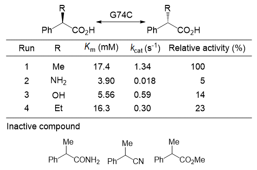 先に述べたようにAMDaseは、アミノ酸ラセマーゼと相同性を有していた。そこで、AMDaseの活性中心に2つ目のシステインを導入すれば、ラセマーゼに変えることができるのではないかと考えた (図7)。α-アリールプロピオン酸に作用するラセマーゼは全く報告がなく、pKa 20程度のα-アリールプロピオン酸のα位のプロトンを、pKa 8程度のシステインのチオールのアニオンが補酵素の助けも借りずに引き抜けるかどうか大変興味が持たれた。そこで、G74C変異体を作成し光学活性なα-アリールプロピオン酸を作用させたところ、野生型にはないラセマーゼ活性を確認した (図7)。また、脱炭酸活性は野生型の2.2%に低下していた。基質特異性を確認したところ、脱炭酸反応においてよい基質は、ラセミ化反応でもよい基質であった13)(図8)。この事実は、脱炭酸とラセミ化が同じ活性中心で起こっていることを示している。また、アミド、ニトリルやエステルには活性を示さず、カルボキシル基がバインディングに必須であることがわかった。エチル基を有する基質は、脱炭酸反応は進行しないがラセミ化が進行した唯一の化合物であった (Run 4)。現在、基質と酵素のドッキングシミュレーションの結果を用いて、G74Cラセマーゼの機能改変を進めている。