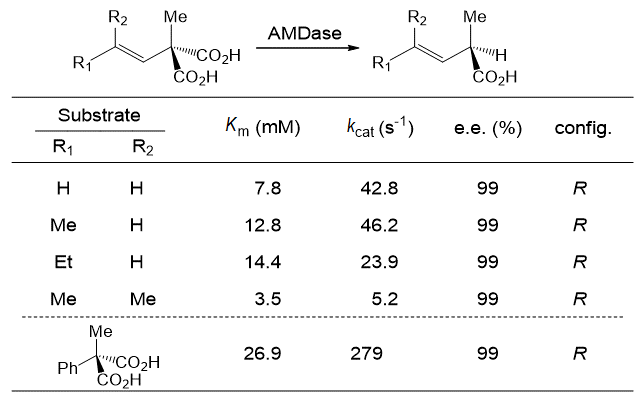 Micklefieldらのグループは、アリール基ではなくアルケニル基を持つ基質についても、AMDaseが作用し同様の脱炭酸反応が進行することを報告している16)(図9)。反応の立体選択性は、アリール基の場合と同じであった。また、反応性については、アルケニル型基質の方がKm値は良いが、反応速度はアリール型基質の方が高い値を示した。アルケニル型基質の発見により、AMDaseの汎用性は更に広がったといえる。