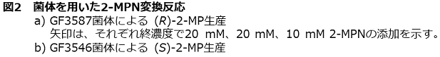 Streptomyces sp. GF3587とGF3546の培養および反応条件を検討した後、休止菌体を調製し、菌体による2-MPNの不斉還元反応を試みた。本反応には、エネルギー源が必要であり、補酵素再生のためにグルコースを反応系に添加した。その結果、GF3587菌体は、100 mM 2-MPNから91 mM (7.7 g/L) (R)-2-MPを99.2%e.e.の光学純度で生成し (図2a)、GF3546菌体は、30 mM 2-MPNから27 mM (2.3 g/L) (S)-2-MPを92.3%e.e.の光学純度で生成した10)(図2b)。この変換反応を経時的に追跡したところ、光学純度に変動はなく、高い光学純度が維持されていた。