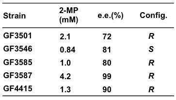 酵母は、一般的に還元活性が強く、カルボニル還元酵素6) やα, β-不飽和ケトンのC=C結合に作用する還元酵素7,8) の存在が報告されている。そこで我々は、酵母にはC=N結合の還元を触媒する酵素活性も潜んでいるのではないかと期待した。最初に研究室保存の酵母226株についてイミン還元活性を調べたが、残念ながら本活性は見出せなかった。次に、細菌261株やカビ84株についても同様にして調べたが、2-MPの生成は見られなかった。最後に、念のため117株の放線菌を調べたところ、土壌放線菌から2-MPを生成する菌株を5株見出した。生成した2-MPは、GITC (2,3,4,6-O-アセチル-β-D-グルコピラノシルイソチオシアナート) を用いて対応するチオウレア誘導体に変換した後、HPLC分析により2-MPの生成量と光学純度を算出した。その結果、4菌株が、2-MPNから (R)-選択的に2-MPを生成し、1菌株のみが、 (S)-選択的に2-MPを生成することが判明した (表1)。それらの中で、高活性な (R)-選択的イミン還元活性菌GF3587と (S)-選択的イミン還元活性菌GF3546について、16S rDNA解析を行ったところ、両菌株ともStreptomyces属菌と同定された。