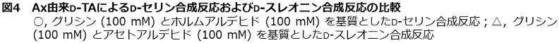 そこで、我々は、D-セリン合成活性を有するD-TAを見出すために、種々の細菌からスクリーニングを実施した。既知D-TA遺伝子のDNA配列のアライメントを作成し、保存配列に基づいてデザインしたプライマーを用いて、ゲノムPCR法によりD-TA遺伝子の探索を行った。その結果、Achromobacter ylosoxidans ATCC 9220 (以下Axと略す) から新規なD-TA遺伝子を取得することができた9)。本遺伝子のORFは1,140塩基で、379アミノ酸からなるタンパク質をコードしていると推定された。本酵素のアミノ酸配列は、D-セリンに作用しないことが報告されているA. sp. DK-38由来D-TAのアミノ酸配列に対して88%と高い相同性を示した。次に、我々が取得した新規D-TAが標的とするD-セリン合成活性を有するか評価するために、まずAx由来D-TA遺伝子を高発現する組換え大腸菌を作製した。続いて、大腸菌から組換えD-TA酵素を精製して、グリシンとホルムアルデヒドを基質とした合成反応を行った結果、生成物としてD-セリンが検出された。また、この合成反応では、L-セリンが全く検出されず、D-セリンの光学純度は99.9%ee以上であった。図3に示すように、Ax由来D-TAが極めて高い立体選択性を有するD-セリン直接合成酵素であることを見出した。本酵素はグリシンとアセトアルデヒドを基質としたD-スレオニンへの変換反応も触媒する。生成物のD-スレオニンは、スレオ体とエリスロ体のほぼ1:1のジアステレオマー混合体であり、既知のD-TA同様、その立体選択性はα位で厳密であるが、β位では極めて低かった。さらに、精製酵素を用いて、D-セリンとD-スレオニンの合成反応を行った。グリシンとアルデヒドの濃度をそれぞれ100 mMとして反応させたところ、初速はD-セリン合成の方が遅いという結果となった。しかしながら、反応収率を見てみるとD-スレオニン合成が50%程度に留まったのに対して、D-セリン合成では95%にまで達した (図4)。また、逆反応の試験ではAx由来D-TAがD-セリンの分解活性を示したことから、A. sp. DK-38由来のD-TAとは異なる基質特異性を有していることが明らかとなった。以上のように、新規Ax由来D-TAは高収率かつ高立体選択的にD-セリンを直接合成することから、 D-セリンの工業的生産に適した酵素であると言える。