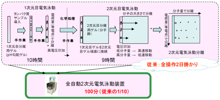 従来の2次元電気泳動による分析では、一連の実験操作が全て手作業です。1次元目や2次元目の電気泳動はそれぞれ別の器具を用いますが、柔軟で変形しやすいゲルは取扱いが難しく、実験操作は煩雑であり、再現性の良い結果を得るためには高度な技と熟練を要しました。また、分析開始から結果を得るまでの全操作が2日掛かりとなるため、大量のサンプル分析を必要とする臨床研究においては、著しく効率が悪く、ごく限られた利用に留まっていました。