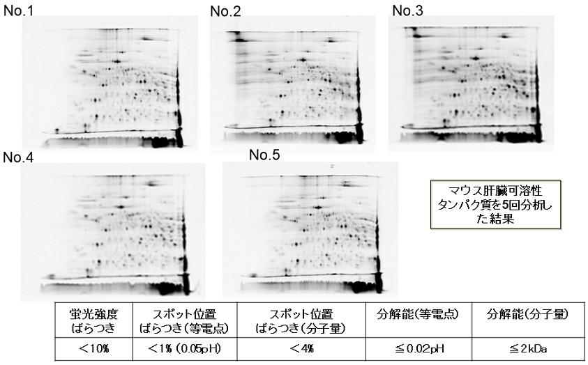 また、従来の2次元電気泳動では、分離結果の再現性が悪い、そのため定量的な比較は困難である、と考えられていました。研究者の熟練度合いが再現性に反映される側面が多々ありますので、2次元電気泳動が敬遠される理由の1つでもありました。自動化にあたっては、電気泳動時の各条件が正確に再現されれば、分離結果の再現性も必ず改善するはずと考え、いくつかの施策を講じています。