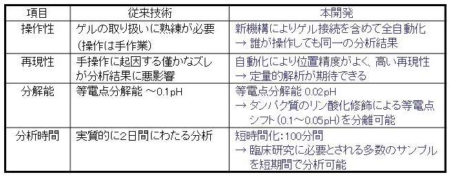 今回開発した装置は、全自動かつ短時間で2次元電気泳動結果をもたらします。これにより、大量の臨床データを処理することが必要であった疾病プロテオミクス分野でも、広く2次元電気泳動法を用いることが可能となります。さらに、医学研究のみならず、製薬業界や食品検査等でタンパク質を網羅的に分析する場合や、微細な化学変化を含む分析が必要とされる分野でも、本開発成果の利用が期待されます。