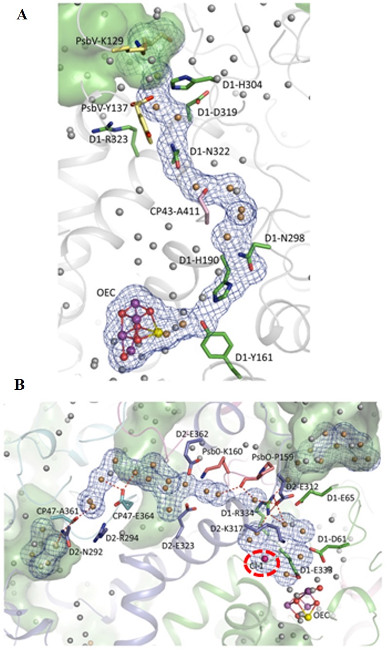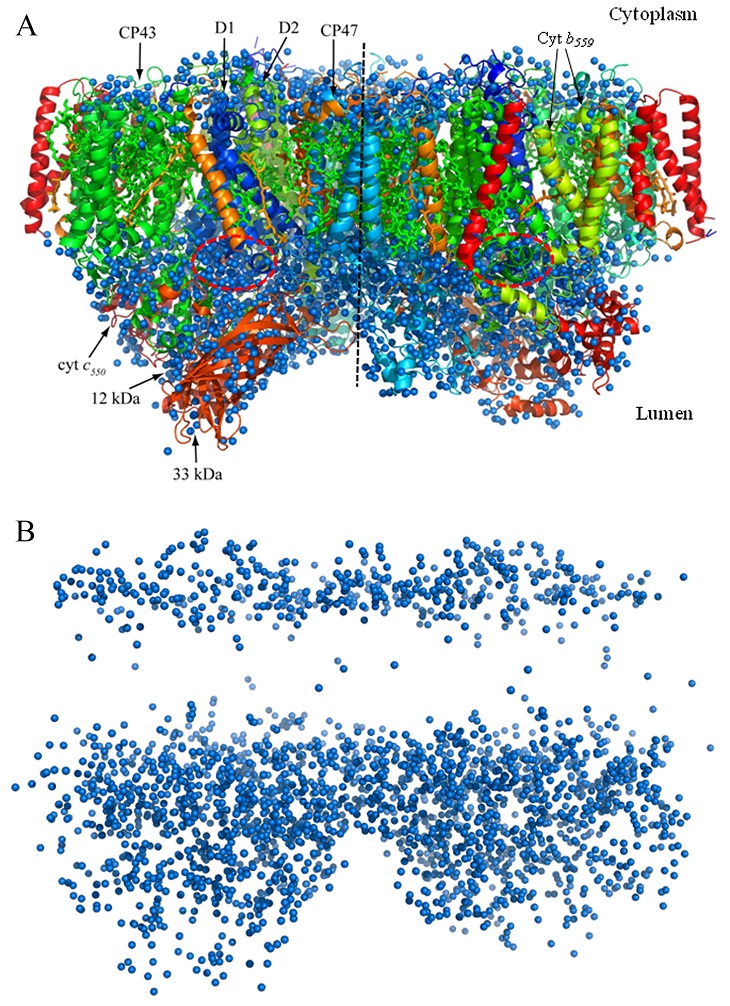 水のほとんどは、チラコイド膜のストロマ表面とルーメン表面という2つの層に分布しており、膜貫通領域にはわずかな水しか存在していない (図1B)。これは膜タンパク質の一般的な特徴とも言えるが、PSIIではチラコイド膜のルーメン側により大きな親水性領域があり、より多くの水分子が分布している。また、水分子は、膜表面から突き出ているD1, D2, CP47, CP43と呼ばれる4つの大きな膜貫通サブユニットの親水性ループや3つの表在性タンパク質の中にも多く存在し、ルーメン側に大きな親水性領域が存在することと対応している。これら水分子には、水分解の触媒中心であるMn4CaO5クラスターの配位子や水素結合ネットワークの形成に関与しているものもあり、PSIIにとって重要な機能の一部を担っている (後述)。