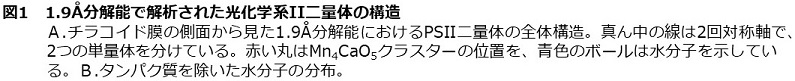 二量体として存在するPSIIの構造を図1に示す。図1の構造では、1回膜貫通へリックスを持つ低分子量サブユニットの一つPsbYが脱落し、単量体当たり19個のサブユニットがあり、計35本の膜貫通へリックスが存在している。1.9 Å分解能で解析されたPSII構造の最大の特徴の一つは、多くの水分子が見つかったことである (図1)。最終的に決定された構造では、PSII二量体あたり2795個の水分子が同定された。同じ結晶を用いて、1.75 ÅのX線波長で収集した回折データを用いて解析された2.5 Å分解能の構造では、二量体あたり862分子の水しか見つからなかったので1)、水分子の同定に高い分解能が如何に重要かが分かる。