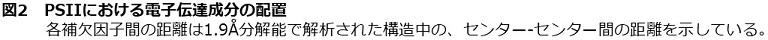 PSIIでは、反応中心のクロロフィルにおいて光エネルギーを吸収し、一連の電子伝達反応を行っている。その電子伝達系の配置を図2に示す。これらの電子伝達成分は、D1, D2と呼ばれる2つの反応中心サブユニットに結合しており、左右で疑似2回対称性を持つ2本のブランチを形成しているが、電子伝達は、左側のD1ブランチでのみ行われる。このような電子伝達活性の非対称性には、左側の水分解触媒のMn4CaO5クラスターの存在 (後述)、反応中心におけるクロロフィル配置の非対称性1)、およびD1, D2両サブユニットのいくつかの対称的な位置でのアミノ酸の相違1,3) などの因子が寄与していると思われる。
