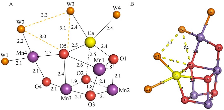 このようなゆがんだ形を作り出している要因は2つあり、1つはMn-O間とCa-O間の結合距離の違い、もうひとつは5つのオキソ酸素の間で、金属イオンとの結合距離に違いがあることである。Mn-Oの典型的な結合距離は1.8-2.1 Åであるが、それに対して、Ca-O間の結合距離は2.3-2.5 Åと明らかに長い。また、5つのオキソ酸素のうち、O1-O4に比べて、O5とMn、あるいはO5とCaとの結合距離が明らかに長くなっていた。例えば、O5-Mn3の距離は2.4 Åで、O5-Mn1, O5-Mn4の距離はそれぞれ2.6 Å,2.5 Åであった。これらの距離は、無機Mn化合物と比較すると長く、結合していないことを示唆している。このことは、5つのオキソ酸素のうち、特にO5は周りの金属イオンとの結合が弱くて切れやすい、言い換えれば、O5が高い反応性を有していることを示唆している。