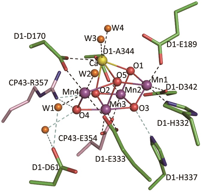 オキソ酸素と水以外に、7つのアミノ酸がMn4CaO5クラスターの配位子として働いていることが分かった (図4)。このうち、6つがカルボキシル基で、1つがHis残基であった。カルボキシル基のうち、1つがCP43というサブユニット由来のGlu354で、他はすべてD1サブユニットのものであった (D1-Asp170, Glu189, Glu333, Asp342, およびC末端であるAla344)。そして、His残基もD1由来のHis332であった。His残基はMnと1本の結合を作っているが、カルボキシル基のうち、D1-Asp189以外はすべてそれぞれ2つの金属イオンにブリッジする形で2本の結合 (bi-dendate結合) を作っている。その結果、すべてのMnには6つの配位子、そしてCaには7つの配位子が存在していることになる。