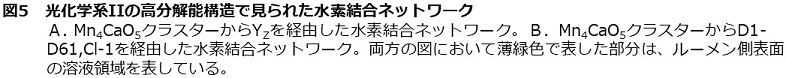 水素結合ネットワークの1つはYZを経由したものである。YZがPSIIの反応中心クロロフィルとMn4CaO5クラスターの間の電子伝達だけでなく、水分解に伴うプロトンの排出にも関わっていることは以前から示唆されていた4,5)。高分解能構造において、YZはCaに結合している水分子W4と直接、またはW3、さらにMn4に結合しているW1, W2とは別の水分子を経由して間接的に水素結合でつながっている (図5A)。一方、Mn4CaO5クラスターの反対側でYZはD1-His190と水素結合し、D1-His190はさらにD1-Asn298や他のいくつかの荷電/親水性アミノ酸、および水分子と水素結合ネットワークを形成し、このネットワークは最終的にルーメン側の溶液と接している。したがって、このネットワークはMn4CaO5クラスターからルーメン側溶液へのプロトンチャンネルとして働いている可能性がある。このネットワークは、YZの電子伝達活性と連動していることから、PCET (proton-coupled electron transfer) パスとも呼ばれている。