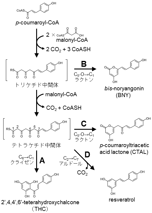 CHSはフェニルプロパノイド経路からフラボノイド生合成への分岐点を触媒する鍵酵素である。しかし、その機能の重要性にもかかわらず、CHSの生成物特異性は低く、主生成物であるカルコンの他に副生成物を多量に生成してしまうことが知られている。CHSは開始基質であるp-coumaroyl-CoAに3分子のmalonyl-CoAを順次縮合させジケチド中間体、トリケチド中間体、テトラケチド中間体を生成し、最終的にテトラケチド中間体の分子内クライゼン環化によりTHCを生成する (図2、反応A)。しかし同時に、トリケチド中間体またはテトラケチド中間体が酵素の活性部位から遊離して分子内ラクトン化した副生成物、bis-noryangonin (BNY) またはp-coumaroyltriacetic acid lactone (CTAL) がそれぞれ生じる (図2、反応B、C) 9,10)。また、テトラケチド中間体がアルドール環化を受けることでresveratrolが生成されることも報告されている9) (図2、反応D)。これら副生成物の生成比率はCHSの起源や反応条件により様々であるものの、一般的にCHSは主にCTALを副生成物として生成し、総生成物量に占めるCTALの生成比率は30~90 mol%にも達する6,9,10)。こうしたCHSの生成物特異性のあいまいさはフラボノイド代謝を考える上で非常に非効率的であり、生体内にはこれを克服する機構の存在が想定されていたが、最近まで不明のままであった。