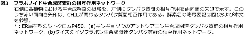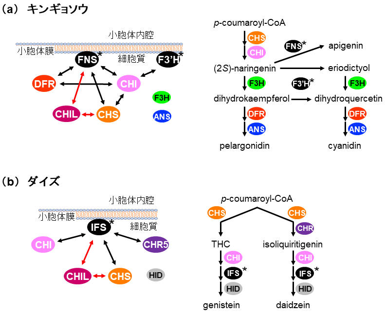 CHILがどのようにしてフラボノイド生産増強に寄与しているかを明らかにするため、フラボノイドメタボロンへのCHILの関与が調べられた。フラボノイドメタボロンがよく研究されているキンギョソウおよびダイズにおいて、CHILとフラボノイド代謝酵素群との相互作用が酵母ツーハイブリッド法および2分子蛍光補完法により総当たり的に解析された6)。その結果、CHILはCHSやシトクロムP450 [キンギョソウではII型フラボン合成酵素 (FNS)、ダイズでは2-ヒドロキシイソフラバノン合成酵素 (IFS) ] と相互作用することが明らかになった (図3)。また、上述のように、CHILはフラボノイド生合成上流の酵素に寄与することが想定されており、上流の酵素としてフラボノイド初発酵素であるCHSが着目され、様々な植物種においてCHILとCHS間の相互作用解析が行われた。その結果、現在までに、コケ植物であるヒメツリガネゴケおよびゼニゴケ、シダ植物のイヌカタヒバ、裸子植物のイチョウ、単子葉植物のイネ、双子葉植物のシロイヌナズナ、ダイズ、キンギョソウ、アサガオ、トレニア、ホップ、アジサイ、ブドウなど、解析された陸上植物すべてにおいてCHSとCHIL間の相互作用が普遍的であることが明らかとなった6,13,15)。