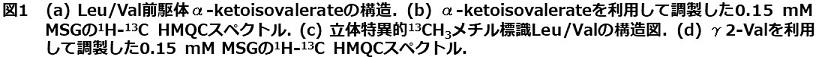 我々は、このようなメチル基標識技術の問題点を克服するため、新たな安定同位体標識手法を開発した。従来の、安定同位体標識されたLeu, Valの前駆体を利用する代わりに、独自のSAIL技術を駆使して、立体特異的に13CH3を導入したLeu, Valを合成した (図1c)9)。α-ケト酸の代わりに、これら立体特異的メチル標識アミノ酸を利用することで、アミノ酸残基特異的かつ立体特異的にメチル基を標識することができる。つまり、Leu残基のδ1メチル、δ2メチル、Val残基のγ1メチル、γ2メチルを自由自在に組み合わせて、観測することが可能となる。例として、MSGについてVal残基のγ2メチルのみを13CH3標識したときの1H-13C HMQCスペクトルを示す(図1d)。α-ケト酸を利用した例 (図1b) と比較して、大幅にNMR信号同士の縮重が抑えられていることがわかる。分子量100 kDaを超えるような超高分子量蛋白質や蛋白質複合体においても、一つ一つのNMR信号を明確に帰属することができ、リガンドとの相互作用解析や構造変化に伴うNMR信号の変化を正確に捉えることが可能となる。また、立体特異的メチル標識アミノ酸を利用することで、安定同位体の導入率も大幅に改善できた。蛋白質生合成に広く利用されている大腸菌BL21 (DE3) 株を利用する場合、培養培地1Lあたり20 mgのLeuおよび100 mgのValを添加することで、目的蛋白質のLeu,Val残基にアミノ酸残基特異的かつ立体特異的に、13CH3を90%以上の導入率で標識することができる9)。α-ケト酸を利用する場合と同等のコストで、メチル基のNMR信号を高感度に観測できるため、微量な高分子量蛋白質を対象としてNMR実験が可能であり、メチル基同士の距離情報も効率よく観測することができる。