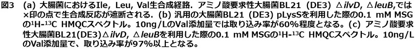 一方で、大腸菌のアミノ酸生合成過程の問題上、アミノ酸の種類によっては、代謝拡散によって、目的外のアミノ酸にも安定同位体が標識されてしまうことがある。また、添加したアミノ酸が、目的蛋白質へ効率よく取り込まれるために、添加量を十分に検討する必要がある。例えば、前述したLeuおよびValの場合、大腸菌の生合成経路においていずれもピルビン酸を出発点として合成されるが、Val生合成の下流でLeuが合成されている (図3a)。したがって、大腸菌培養培地にValを添加するとLeuも同時に安定同位体標識されてしまう。実際に、培地1LあたりにValを100 mg、Leuを20 mg同時に添加しないと、Valの目的蛋白質への取り込み率は90%を超えない9)。Val残基以外にも、Alaなどは生合成経路が多岐にわたるため、数百mgのAlaを加えても高い取り込み率を実現することは難しい14)。大量の安定同位体標識アミノ酸を利用することは、試料調製にコストがかかるため、発現量の少ない高分子量蛋白質への溶液NMR研究の応用に大きな障壁となる。我々は、目的蛋白質へのアミノ酸取り込み率の改善を図るため、ラトガース大の井上正順博士および石田洋二郎博士に協力を得て、アミノ酸要求性大腸菌株を調製した15)。