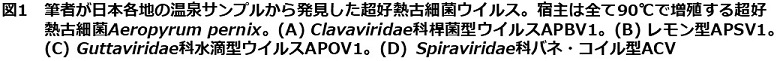 地球上の全ての細胞性生物は、古細菌 (Archaea)、細菌 (Bacteria)、真核生物 (Eukarya) の3ドメインに大別され、その全てにウイルスは存在する。古細菌を宿主とする古細菌ウイルス、中でも熱水系から発見され80℃以上で増殖する超好熱古細菌ウイルスは、形態的にも遺伝的にも独自の世界を構成している。宿主である古細菌の研究は、20世紀後半にカール・ウーズが主要な細菌とは異なる原核微生物群の存在を提唱し始めたのとほぼ同時期に1,2)、カール・シュテッターらが世界各地の熱水環境から次々と新種の超好熱古細菌を発見したことで花開いた。その耐熱酵素の有用性の観点などからも、今日までに古細菌に関わる研究は大きな飛躍を遂げたと言える。特に21世紀に入ってからは、難培養性の常温性の古細菌も数多く分離され、非培養依存のメタゲノム法なども駆使することで、古細菌の全体像は徐々に明らかになりつつある。しかしそのウイルスとなると、培養株は漸く100株を超えた程度で (表1)、まだまだその全体像の理解にはほど遠い。その研究の進捗状況は、関わる研究者の数が少ないこともあり、宿主である古細菌の研究から数十年分、後塵を拝すかのような状況にある。しかしながらウイルスは微生物生態系の重要な構成員であるばかりか、生命の起源を研究する上でも欠かせない存在であり、未知の耐熱酵素の宝石箱でもある。本トピックスでは、世界で最も多種多様な古細菌ウイルスを発見している筆者が、地球上で最も忘れられた生物群とも言える古細菌ウイルスの世界を、超好熱古細菌ウイルスの粒子 (ビリオン) 形態や遺伝子の多様性、生命の起源研究との関わりなどを中心に紹介する。