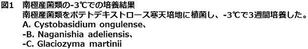 昭和基地における冬季の気温は-40℃前後で、これは筆者が現在住んでいる北海道旭川市の最低気温とあまり変わらない。しかし夏季には30℃以上になる北海道とは異なり、南極の昭和基地では1年のうち10ヶ月間は平均最高気温がマイナスとなっている。つまり、昭和基地では1年の大半を0℃以下の気温となる。では、南極に生息している菌類は氷点下でも成長するのだろうか?筆者は昭和基地のある東オングル島から分離した生育上限温度が15℃以下の好冷菌から30℃まで成長が可能な耐冷菌までの16種を選抜し、-3℃で培養することで氷点下における成長能を調べてみた。-3℃という培養温度は、インキュベータなどの温度の誤差を考慮すると、菌類の培養実験で広く使われているYPD液体培地やポテト・デキストロース寒天培地が凍らない下限の温度である。その結果、至適増殖温度や増殖上限温度に関わらず、全ての種で-3℃での増殖を確認した7)。実際に-3℃で3週間培養した際のシャーレの写真が図1である。3週間の培養で、はっきりとコロニーが確認できるまで増殖しているのが分かる。