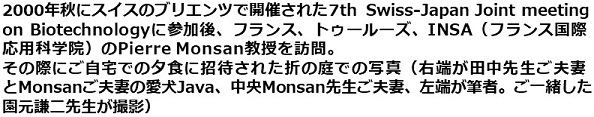 先生は、昭和61年京都大学工学部教授に就任され、工業化学科工業生化学講座を担当されました (平成5年の大学院重点化施策にともない、本講座は大学院工学研究科合成・生物化学専攻生物化学講座応用生物化学分野へと改組された。現在、本講座のDNAは同生物化学講座の分子生物化学分野、生物化学工学分野に引き継がれてい)。平成14年に定年退職されるまで数多くの優れた研究成果を挙げられましたが、特に生体触媒の固定化とその利用に関する研究、炭化水素代謝に関与する酵母のペルオキシゾームの機能解明研究において先駆的な研究業績を挙げられ、バイオテクノロジー分野において大きな貢献をされました。原著論文は400報を越え、これに基づいた業績は国内外で高く評価され多くの賞を受賞されました。平成9年にはデンプンを利用できる酵母の新しい育種技術を発表され、これを契機として目的のタンパク質を酵母の表層に提示する 「細胞表層工学」として技術を体系化されました。新たな武器を付与した酵母という位置付けからArming yeastと呼ばれましたが、田中先生はChを付け加えたCharming yeast という呼び方をよく使われていました。先生らしい茶目っ気を感じるものでした。固定化酵素の概念の提案者でありイスラエルの元大統領でもある 故Katchalsky-Katzir博士 (テルアビブ大学教授、ワイズマン研究所教授) が、田中先生の細胞表層工学技術を「これぞ未来型の固定化技術」と絶賛されたことは、大変嬉しいニュースでした。