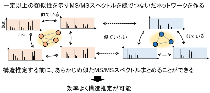 しかし、自動では同定できなかったMS/MSスペクトルの中にこそ、まだ人類の知らない新たな化合物が眠っている可能性が高く、膨大な未知データから解読する価値のあるデータを簡便に見出す方法論が必要である。この要求に応えるべく、近年、天然物化学の分野で、Molecular spectrum networkingという情報科学的な手法が開発された13)。この方法は、近しい構造の物質は互いに似たMS/MSスペクトルを示すという性質を利用し、MS/MSスペクトルの類似度に基づく分子構造ネットワークを作成する技術である (図2)。これを使えば、未同定なりにも互いに似た構造を持つと推測されるMS/MSスペクトルを簡便に見出すことができる。