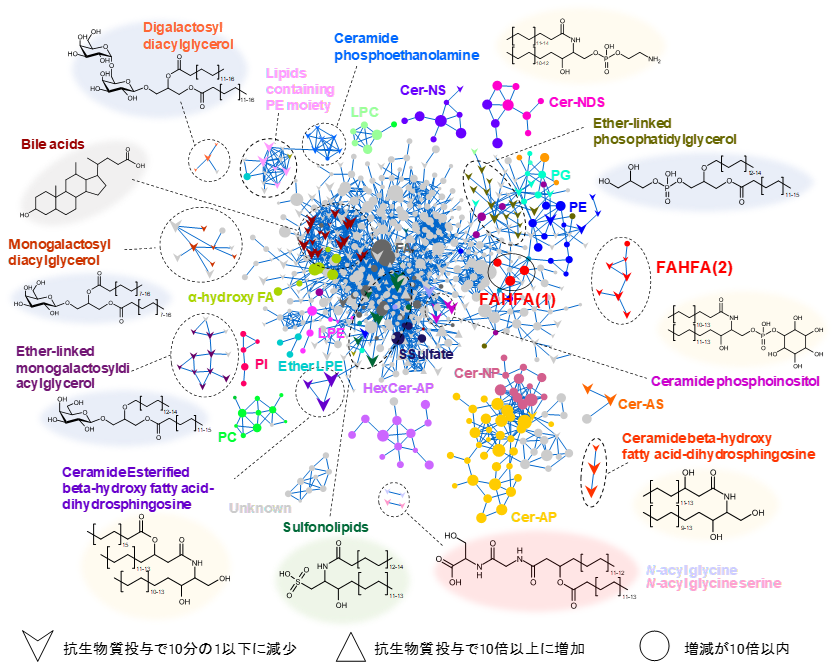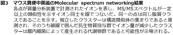 ここでは、ノンターゲットメタボロミクスとMolecular spectrum networkingを組み合わせて、マウス腸内に共生する細菌叢の脂質解析に取り組んだ、我々の最近の研究成果を紹介したい11)。腸内細菌の脂質は、宿主にないユニークな構造を有し、宿主の疾患や生体恒常性の制御に関わることから、生理活性物質の宝庫である。例えば、菌体表層を覆い、宿主と接する脂質膜成分は、宿主のパターン認識受容体を介して自然免疫応答を引き起こすことが知られており14)、宿主免疫機能の活性化やワクチンの効果を強めるアジュバントとしての活用が期待される。そこで、それらの全体像をとらえるべく、野生型マウスの糞便の総脂質画分を抽出し、液体クロマトグラフィー-四重極飛行時間型質量分析装置 (LC-QTOF/MS) を用いてノンターゲットメタボロミクスを実施した。10818個のイオンが観測され、そのうち既存のライブラリで同定できたのは全イオンの内の7.9% (855種) と、多くの未同定化合物が存在することが分かった。これらの未同定分子の構造を効率よく推定するべく、Molecular spectrum networkingを適用し、MS/MSスペクトルネットワークを作成した (図3)。図3の各点が計測されたイオンを表し、互いに似た構造を持つと推定されるイオン同士が線でつながれたクラスターを形成している。ここからさらに腸内細菌によって産生される分子を絞り込むために、抗生物質カクテルを投与したマウスの糞便を同様に分析した。抗生物質投与群で減少したイオンは腸内細菌によって産生されていた可能性を示唆する。そのようなイオンを図3では下向きの矢印で表記した。これより、図3の破線で囲ったクラスターに属する代謝物は、抗生物質投与で量が減少したことから腸内細菌由来の代謝物であることが強く示唆され、優先的に構造解析するべき対象であると絞り込むことができた。これらのクラスターに含まれるMS/MSスペクトルから構造を推定したところ、エーテル結合をもつグリセロ脂質、極性頭部にホスホエタノールアミンやホスホイノシトールなどの修飾を有するセラミド、脂肪酸のβ位にヒドロキシ基があるセラミド、炭素―硫黄原子が直接結合したスルホノリピド、グリシンやセリンで抱合された脂肪酸代謝物など、哺乳類には見られない多様な構造の脂質分子群の存在が明らかとなった。