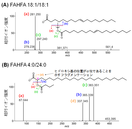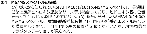 さらに興味深いことに、互いに類似の構造を有しながら、2つのクラスターで抗生物質投与による量的変動の傾向が異なる脂質Fatty Acid esters of Hydroxyl Fatty Acid (FAHFA)が見出された (図3、FAHFA(1)と(2))。FAHFAは脂肪酸とヒドロキシ脂肪酸がエステル結合した脂質の総称であり、先行研究では宿主によって長鎖脂肪酸同士がエステル結合した分子が産生されると報告されていた15)。この既報と一致して、FAHFA(1)は長鎖同士のエステル結合分子と推定され (図4A)、抗生物質投与群での顕著な現象は見られなかった。一方、FAHFA(2)は、抗生物質投与で20分の1以下に減少しており、腸内細菌叢によって産生されている可能性が強く示唆され。そこで、MS/MSスペクトルから構造を読み解くと、FAHFA(2) は極長鎖ヒドロキシ脂肪酸 (炭素数20 ~ 24) に短鎖脂肪酸 (炭素数2 ~ 5) がエステル結合した構造であると推定された (図4B)。さらに、FAHFA(2)のMS/MSスペクトルからは、FAHFA(1)にはみられない、ヒドロキシ基の位置が極長鎖脂肪酸のα位であることを示す特徴的な断片イオンが観測された (図4B)。実際にFAHFA(2)に相当する化合物を有機合成し、LC-QTOF/MS解析で同一の保持時間およびMS/MSスペクトルを示したことから推定構造が正しいことを実証した。このユニークな構造の脂質は既存データベースに収載がなかったことから、我々はこの新規脂質群をAcyl Alpha-Hydroxy Fatty Acid (AAHFA) と名付けた11)。このようにMolecular spectrum networkingは、膨大なノンターゲットメタボロームデータから似通った構造を持つイオン群を分類することができ、効率よく新たな分子を見出すのに威力を発揮する。本解析に必要な装置のセッティングや前処理法、Molecular spectrum networkingの実施方法などは筆者らの原著論文中で詳しく解説しているので、興味があればぜひトライしていただきたい16)。