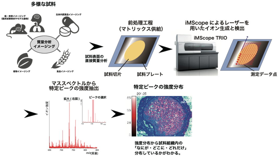 MSIのコンセプトは試料表面での直接質量分析である。試料表面に存在する分子をMALDIでイオン化し質量分析部で検出することにより、強度分布をマッピングできる。MSIのワークフローを図1に示す。試料は、動物、植物および食品でも対応が可能である。ただし、すでに述べた通り、MSIは試料表面で質量分析を行うため、試料採取が必要となる。例えば、ヒト試料を対象とする場合には、手術検体や生検により採取され、動物試料であればマウスなどのげっ歯類から臓器や腫瘍組織を採取する。採取された試料は、一般にドライアイスや液体窒素を用いて凍結されるが、分子の拡散や流出を防ぐため通常化学固定などは行わず、試料採取後、迅速に凍結を行う。凍結された試料は、クライオミクロトームを用いて厚さ5-20µm (試料の性状によるパラメータとなる) で凍結切片を作製した後、導電性を有する透明なガラスプレートに載せられる。ここで用いるガラスプレートとして、通常インジウムスズ酸化物でコーティングされたITOガラスを使用する。その後、イオン化補助剤である「マトリックス」を試料表面に供給し、MALDIを用いて分析を行う。分析では、組織表面にデータ取得点を設定し、その位置情報とともに各点でマススペクトルを取得する。なお、マススペクトルとは横軸が質量をイオンの価数で除したm/z、縦軸がイオン強度で表されたグラフデータである。